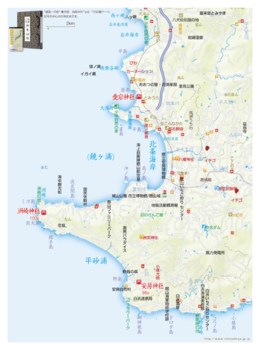 館山駅から洲の崎灯台・安房白浜行のバスで洲の崎灯台で下りる。道路は北から南に通じて周囲にはお花畑が散在し、灯台のある洲崎には鉈切洞窟がある。道を海岸の方に下ると洲崎神社のある御手洗山の森が左に見え、右は海岸である。土地では「すのさき」と呼んでいる。神社の前の道路をへだてて鳥居が海に向かって立っている。遥か沖には大島の御神火の煙が見え、目を転じると三浦半島が見える。その海は黒潮の流れる太平洋である。