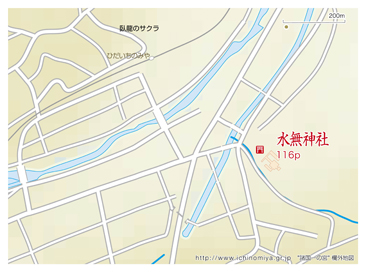 岐阜より富山へ通じるJR高山線で、飛騨一之宮駅から徒歩5分のところの老杉の森の中に水無神社がある。水無は、「みなし」と呼ぶ。水無は水成しの意味で、水主(みずぬし)のことである。