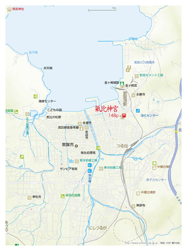 JR敦賀駅から北に1.5kmのところ、近江と越前国に通じる北国街道に面して、青松の茂る広い森がある。緑の神域に総朱塗りの大鳥居が目に入る。この鳥居は正保2年(1645)の建造で、笠木の上に屋根を冠せた両部鳥居の形式で重文になっている。境内は3万7135平方m(1万1253坪)で大鳥居から参道を行くと中鳥居がある。木造朱塗りで寛保3年(1743)に若狭国小浜藩酒井忠用の再建によるものである。本殿は慶長19年(1614)造営の国宝であったが、戦災で焼失してしまった。
