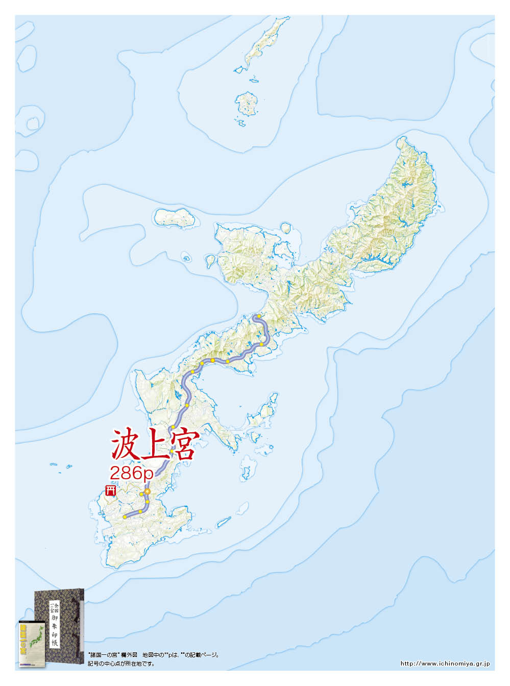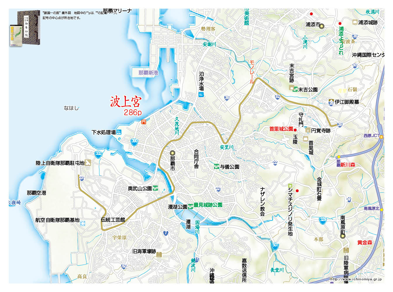 那覇市内バスで西武門で下車すると、紺碧の東支那海を見渡す若狭海岸、那覇埠頭と泊埠頭との間の波之上海岸の断崖の上、珊瑚礁の岩盤に鎮座している。遥かむかしから海の彼方、海神の国「ニライカナイ」の神々に祈った霊応の地、聖地のひとつが波の上の崖端である。